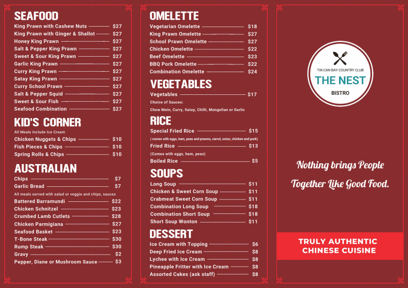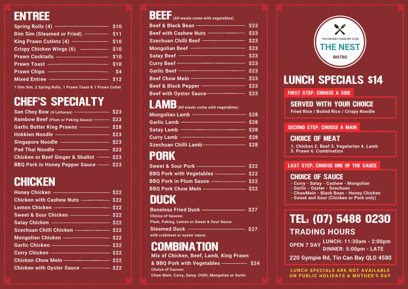 Authentic Chinese food in Tin Can Bay with a great menu catering for the taste buds of Visitors and Members!